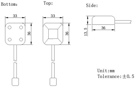 1、北斗車載導(dǎo)航型天線,支持北斗以及GPS頻段,外觀尺寸:36mm×33mm×13.5mm;